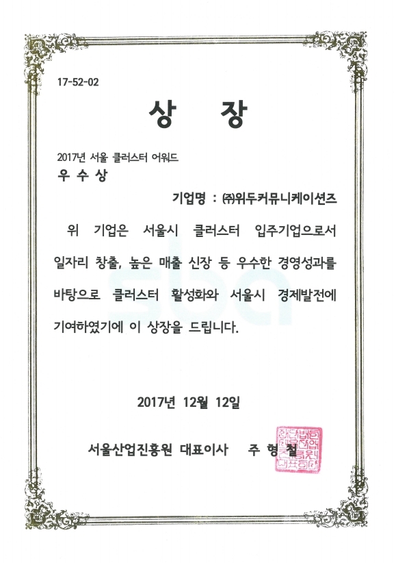서울클러스터 어워드 우수상 페이지 정보 작성자 WeDu 댓글 0건 조회 5,571회 작성일 19-05-30 19:34 본문 2017-12-12 우수상 17-52-02 서울클러스터 어워드 서울산업진흥원 대표이사 주형철 List Previous서울특별시장 표창장 19.05.30 Next산업통상자원부 표창장 19.05.30
