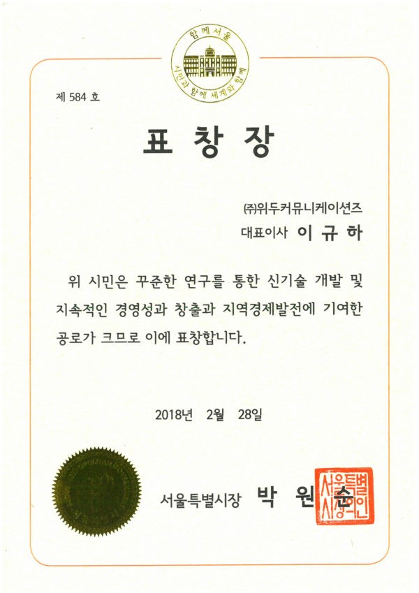 서울특별시장 표창장 페이지 정보 작성자 WeDu 댓글 0건 조회 5,249회 작성일 19-05-30 19:35 본문 2018-02-28 표창장 제 584호 신기술 개발 및 지속적인 경영성 창출, 지역 경제 발전 기여 서울특별시장 박원순 List Previous2018 소년한국 우수 어린이 도서 19.05.30 Next서울클러스터 어워드 우수상 19.05.30