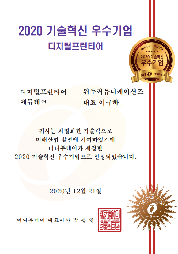 2020 기술혁신 우수기업 페이지 정보 작성자 WeDu 댓글 0건 조회 4,517회 작성일 21-12-31 12:58 본문 2020-12-21 2020 기술혁신 우수기업 디지털프런티어 에듀테크 머니투데이 대표이사 List Previous2020 소년한국 우수 어린이 도서 선정 21.12.31 Next2020 서울산업진흥원 2020 DMC어워드 21.12.31