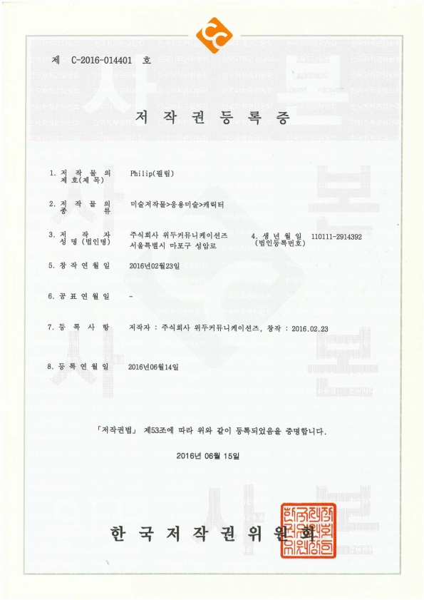 [한국/저작권] 필립 페이지 정보 작성자 WeDu 댓글 0건 조회 4,569회 작성일 19-05-30 19:09 본문 2016-06-14 저작권 C-2016-014401 필립 / 미술저작물>응용미술>캐릭터 List Previous[한국/저작권] 월터 19.05.30 Next[한국/저작권] 아리스 19.05.30