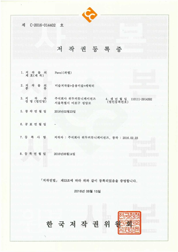 [한국/저작권] 파벨 페이지 정보 작성자 WeDu 댓글 0건 조회 4,627회 작성일 19-05-30 19:11 본문 2016-06-15 저작권 C-2016-014402 파벨 / 미술저작물>응용미술>캐릭터 List Previous[한국/저작권] 누미 19.05.30 Next[한국/저작권] 월터 19.05.30