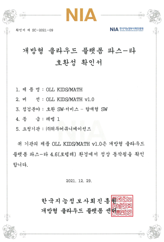 [한국/확인서] OLL KIDS/MATH 파스-타 호환성 확인서 페이지 정보 작성자 WeDu 댓글 0건 조회 7,757회 작성일 21-12-31 12:48 본문 2021-12-29 확인서 제 SC-2021-09 점검분야 : 호환 SW서비스 - 탑재형 SW List Next[한국/인증서] OLL KIDS/MATH 클라우드 서비스 확인서 21.12.31